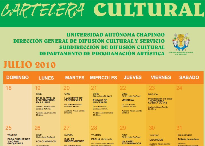 En Chapingo no solo es estudio ni trabajos ni tareas pesadas. Aunque los estudiantes son de tiempo completo siempre hay algun momento del dia en que podemos realizar otras actividades no academicas, ya sea culturales, deportivas o personales. Ante ello, para nuestro acrecentamiento cultural, la Direccion General de Difusion de Cultura y Servicio pone a disposicion en cada semestre de una cartelera de proyeccion de peliculas nacionales e internacionales en el auditorio Alvaro Carrillo; que por cierto una programacion de filmes muy buenos y de las que de alguna manera nos enseña, reflexionamos y aprendemos algo de ellos. Es una cartelera cultural de la que definitivamente nos sirve de mucho.