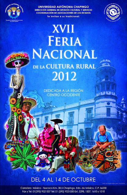 XVII Feria Nacional de la Cultura Rural Chapingo 2012. Dedicada a la region Centro Occidente de Mexico. Del 4 al 14 de Octubre dentro de las instalaciones de la Universidad Autonoma Chapingo.