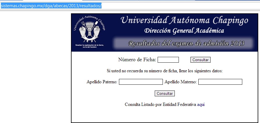 Este domingo 7 de julio de 2013 se publicaron los resultados del examen para el ingreso 2013 a la Universidad Autonoma Chapingo. Los resultados están para todos los aspirantes aceptados, tanto para ingresar a Preparatoria Agrícola como a Propedeutico.
